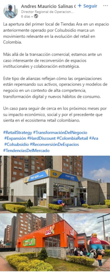 En redes sociales, se conoció la nueva imagen de uno de los supermercados remodelados por Tiendas Ara. Este establecimiento comercial se encuentra ubicado en el barrio Gran Granada, de Bogotá. ”Más allá de la transición comercial, estamos ante un caso interesante de reconversión de espacios institucionales y colaboración estratégica” informó Andrés Salinas, usuario de Linkedin.